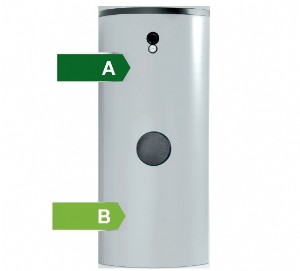 Der Effizienz-Kombispeicher besteht aus zwei getrennten Behältern, einem oberen für Trinkwasser und einem unteren für den Heizungswasserbereich. Im oberen Teil wird das wesentlich wärmere Trinkwasser bevorratet, daher ist dieser Bereich mit einer 50 mm starken, fest aufgeschäumten PU-Hartschaumdämmung versehen. Zusätzlich erhält dieser Bereich, gemeinsam mit dem unteren Heizungswasserbereich, eine weitere Isolierung. Diese besteht aus einer 20 mm Vlies und 50 mm Neoporkombination und fester Außenverkleidung. Also zwei unterschiedliche Behälter mit verschiedenen Temperaturen und Isolierungen. Daraus resultierend erhält der Effizienz-Kombispeicher zwei Energielabel mit hervorragenden Werten!