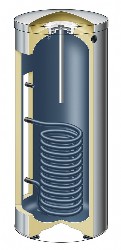Aufheizung des gesamten Wasserinhalts über tief bis zum Speicherboden geführte Heizwendel.